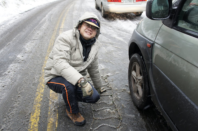 等我們泡好溫泉開始再往山上走時,已經是下午接近四點了。山上的車已經陸續下山,看來賞雪人潮已退。回到原來的19K已無警察站崗,但是路況確實不好,於是我們停下來安裝雪鏈。雖然是第一次自己安裝,我家北極熊技術不錯,安裝的速度和技巧都沒問題。我們家的車第一次裝好雪鏈,我第一次開雪地,真是不錯的體驗。